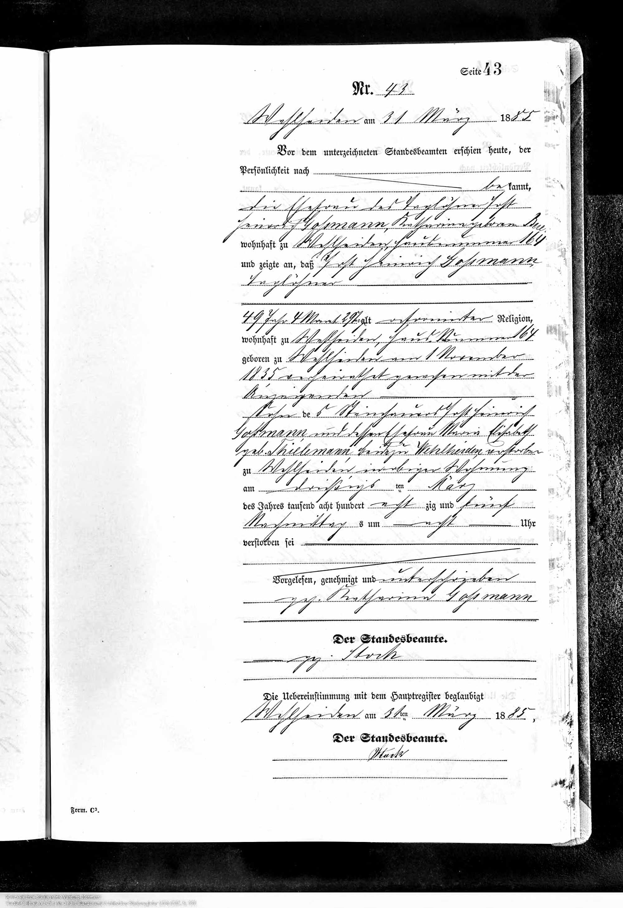 Translation of death record of Jost Heinrich Gossmann, my 3rd great grandfather, “The death was declared by his wife Katharine Gossmann. The couple lived in Wehlheiden house number 164. The deceased was 49 years, 4 months and 2 days old. He was born 1 November 1835 When he died both of his parents had also died in Wehlheiden. His parents’ names are Jost Heinrich Gossmann and Elisabeth Thielemann.