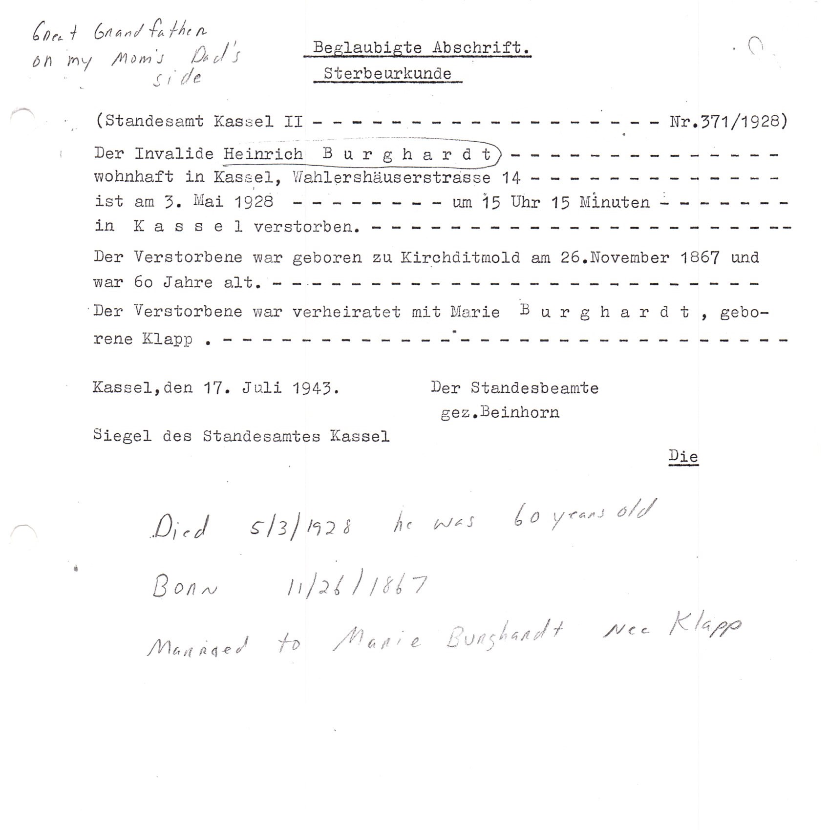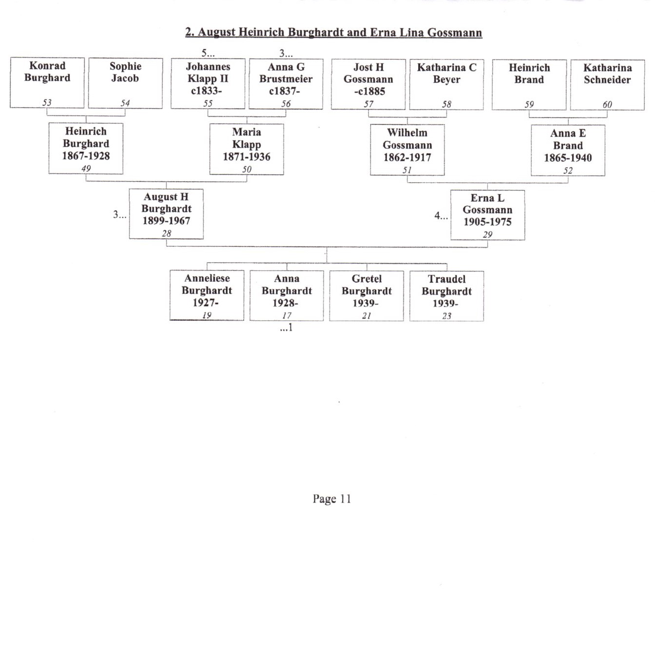I was grateful because I did have a several generations of information. Starting with my grandmother Anne Burghardt (born 1928), I had her father August Heinrich Burghardt and mother Erna Lena Gossmann(my great grandparents. I had my 2nd great grandparents, Heinrich Burghardt and Marie Klapp (August Heinrich Burhardt’s parents) and Wilhelm Gossmann and Anna Elisabeth Brand (Erna Lena Gossmann’s parents. I also had the 3rd times great grandparents as you can see below in n the pedigree chart.