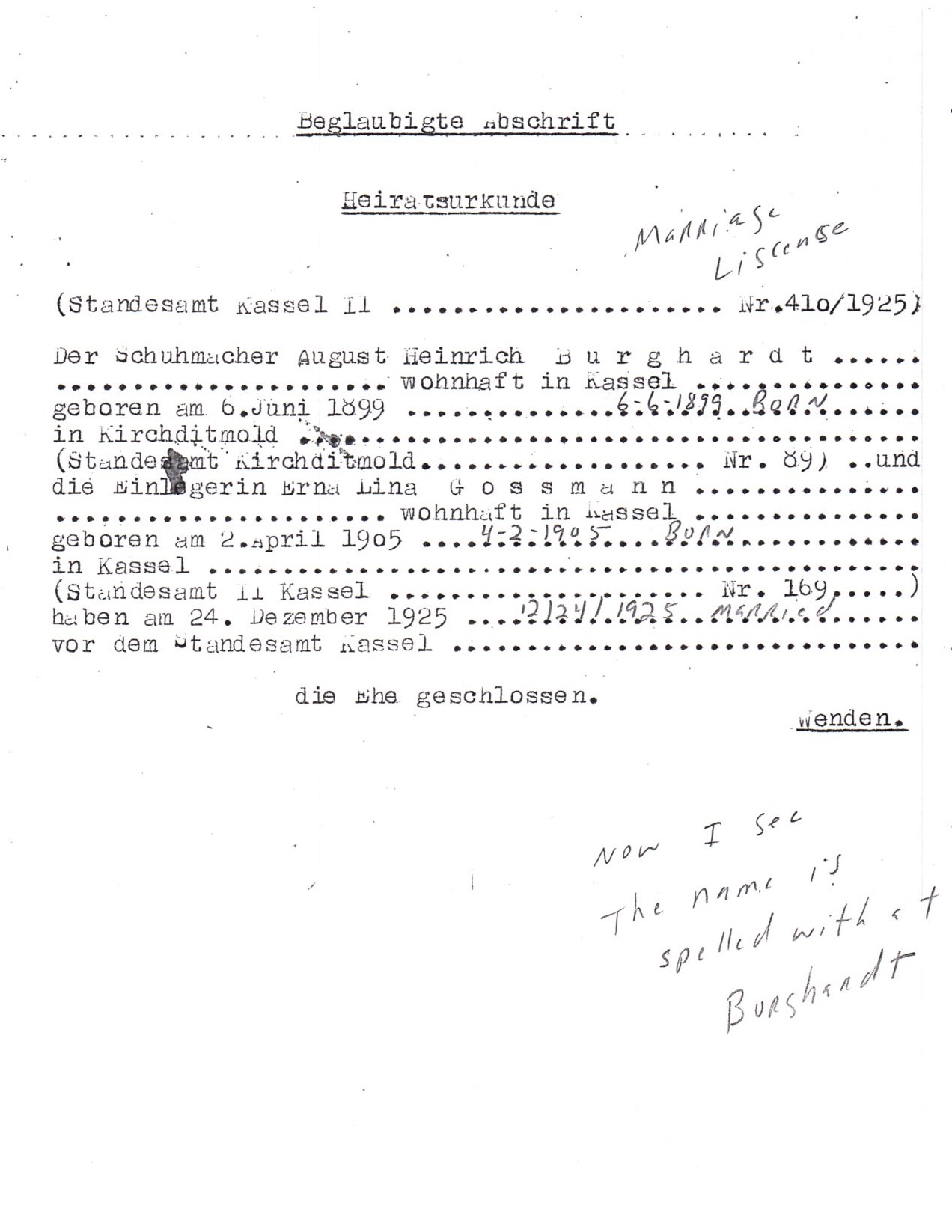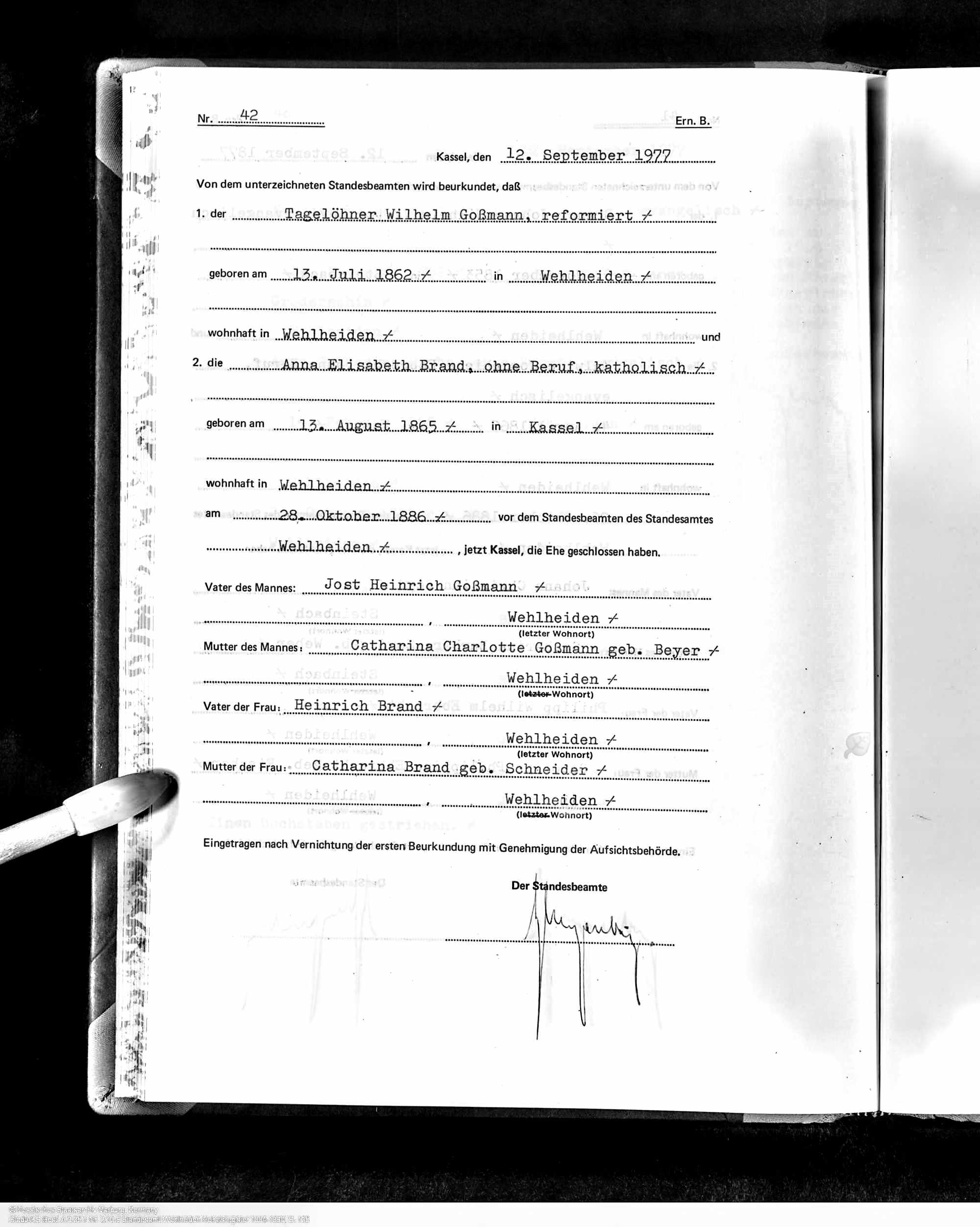I found for you 2 more marriage certificates which might be interesting for you, 2 sisters of Wilhelm Goßmann. Copied Wehlheiden City records for you from Landesarchiv Hessen (search with arcinsys). I will send you copies by email later