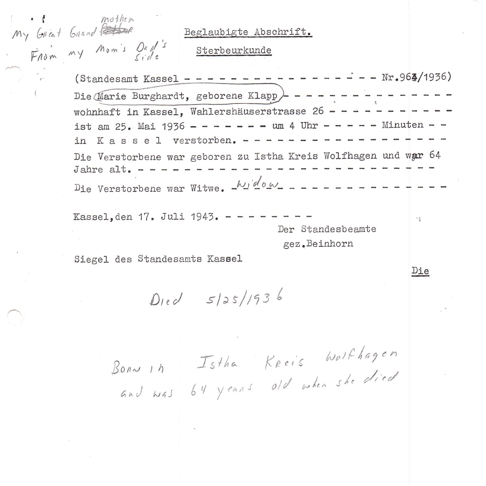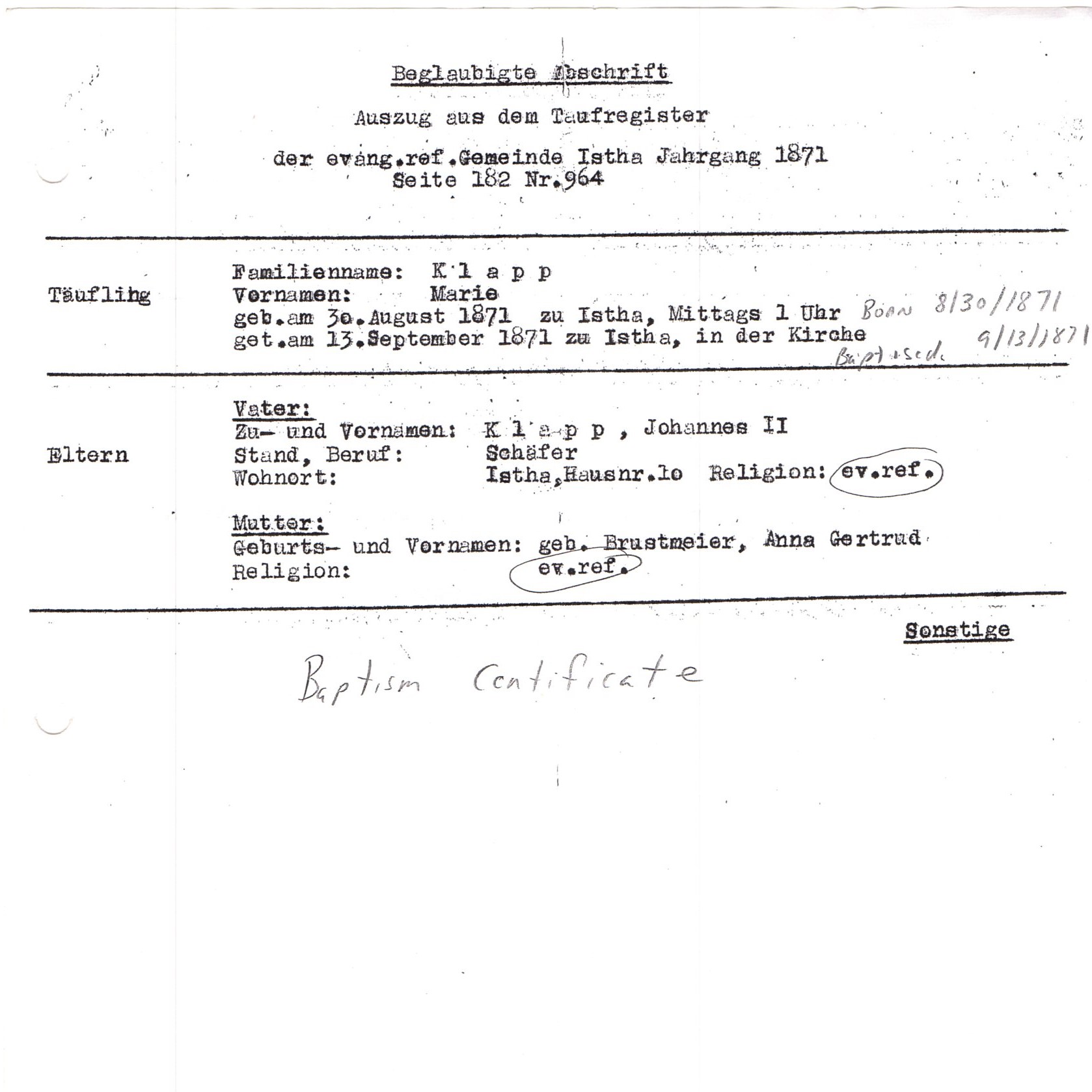 This is my 2nd great grandmothers, Marie Klapp, baptism record and death record. I received these documents from my grandmother, who translated some of the information, for me.