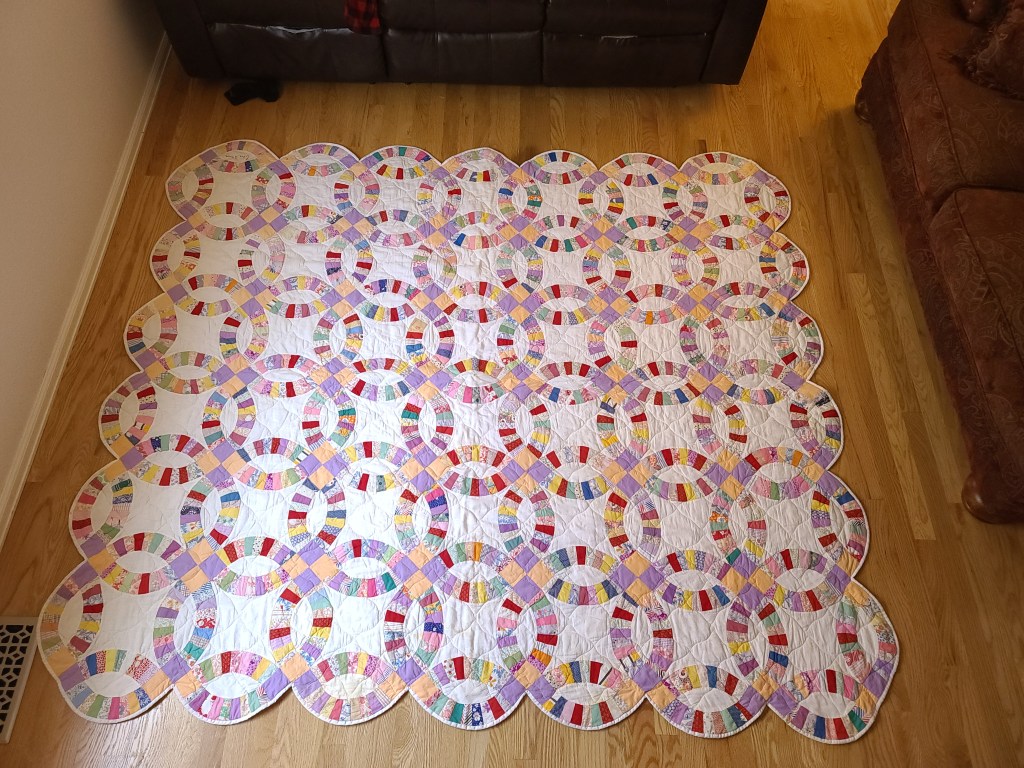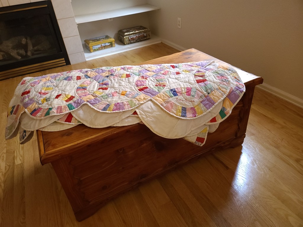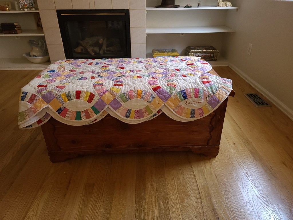 Since it had not been quilted yet, my grandmother’s sisters, Dorthy and Mary Lou, had it cleaned and then had it quilted for my grandmother and it was then passed down to me from my grandmother. I treasure both the cedar chest and the quilt. It helped start my love of old things.