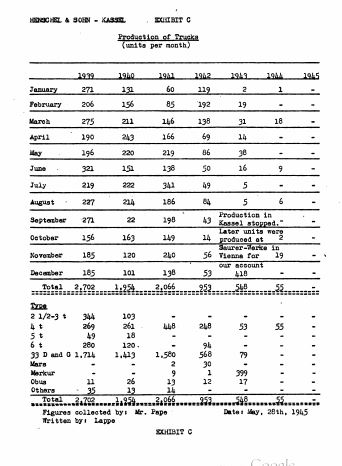 possible by building expansion of the Mittelfeld Works and stoppage of truck production. Locomotive production remained at its peacetime level during the war and amounted to 22 per cent of all German production for 1940 – 1944. Truck production declined progressively and finally stopped in September 1943.” (U.S. Strategic Bombing Survey: Henschel & Sohn, Kassel, Germany, Dates of Survey May 25-26, 1945. United States, n.p, 1947 page 14, section. Accessed October 14, 2020 on google.com/books)