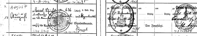 Entry for August Gossmann was born 28 November 1903 and was buried on 31 July 1904 in Kassel, Germany.