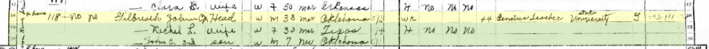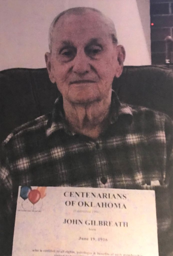 John Cyrus was inducted into the Centenarians of Oklahoma Hall of Fame, in their biography for him they wrote: “John Cyrys Gilbreath, Jr, was born June 16, 1916, in Clinton, Oklahoma; one of five children born to John Cyrys Gilbreath, Sr, and Janie Melinda (Owen) Gilbreath. As a child, he enjoyed trapping muskrats and as he got older, hunting, accompanied by his favorite coon hound Sue. Sue and the other hounds would flush out the game. He recalled how hitchhiking was common when he was young, but not so today. John’s life has been academic: In 1938 he received a Bachelor’s Degree and a Master’s in 1948 from Oklahoma A&M (now OSU). In 1950 he was honored with his Ph.D. in animal science from LSU. He was a professor in Arkansas for seven years and for 19 years at OSU all in animal science. He volunteered as a judge in poultry shows. John met his wife Elizabeth on a blind date. They were married in 1987 in Pawnee, Oklahoma. John had three grandchildren, one great-grandchild, and two great-great-grandchildren. John Cyrus Gilbreath, Jr. was inducted into the Centenarians of Oklahoma Hall of Fame having reached the age of 100 years. He lived 105 years and three months. His centenarian file will be sent to the Oklahoma Historical Society to become a permanent part of Oklahoma History.” Source Find A Grave, Dr. John Cyrus Gilbreath Jr., memorial 79466367, Peggy Barnett 48791192 database online, Find A Grave (www.findagrave.com, accessed 23 February 2023)