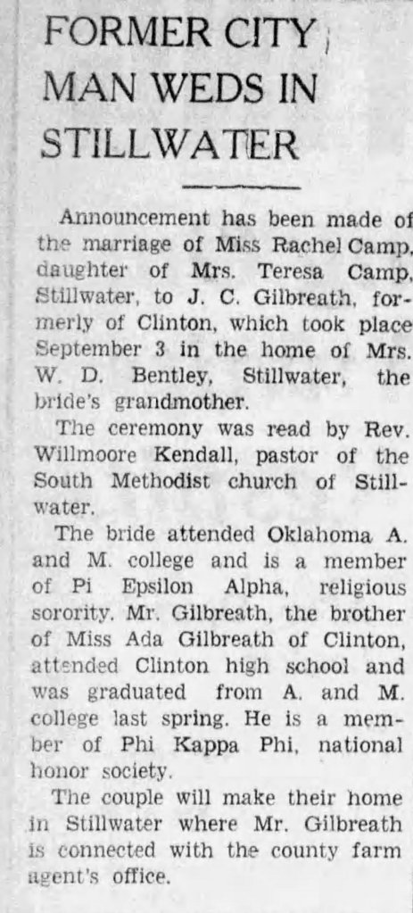 “Announcement has been made of the marriage of Miss Rachel Camp daughter of Mrs. Teresea Camp, Stillwater to J.C. Gilbreath, formerly of Clinton which took place September 3 in the home of Mrs. W.D. Bentley, Stillwater, the bride’s grandmother. the ceremony was read by Rev. Willmoore Kendall, pastor of the South Methodist church of Stillwater. The bride attended Oklahoma A. and M. college and is a member of the Pi Epsilon Alpha, a religious sorority. Mr. Gilbreath the brother of Miss Ada Gilbreath of Clinton, attended Clinton high school and graduated from A. and M. college last spring. he is a member of Phi Kappa Phi, a national honor society. The couple will make their home in Stillwater where Mr. Gilbreath is connected with the county farm agent’s office.”