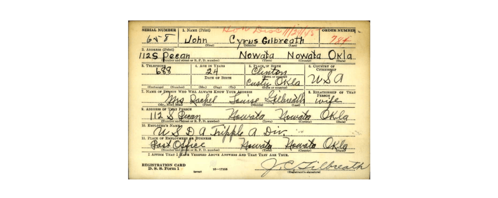 On 16 November 1949 John Cyrus registered for the WWII draft, he was 24 years old and born in Clinton, Custer, Oklahoma. His wife was Rachel Louise Gilbreath and they lived at 112 S Pecan, Nowata, Nowata, Oklahoma. John was working for USDA Tripple A Division. He was 5 Feet 7 3/4 inches in height, weighed 125 pounds had gray eyes, brown hair, and a dark complexion.