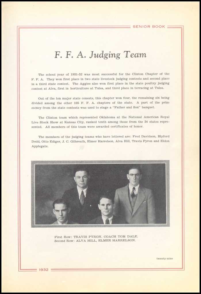 John Cyrus was the fifth and last child born to John Cyrus Gilbreath and Janie Melinda Owen on 19 June 1916 in Clinton, Custer, Oklahoma. Around age 16 in 1932, John Cyrus lettered in FFA. In the 1932 Clinton High School Yearbook it says “The school year of 1931-1932 was most successful for the Clinton Chapter of the F.F.A. They won first place in two state livestock judging contests and second place in a third state contest. The Clinton team which represented Oklahoma at the National American Royal Live Stock Show at Kansas City ranked tenth among those from 34 states represented. All members of this team were awarded certificates of honor. The members of the judging teams who have lettered are Fred Davidson, Blyford Dodd, Otto Ediger, J.C. Gilbreath, Elmer Harrelson, Alva Hill, Travis Pryon, and Eldon Applegate.”