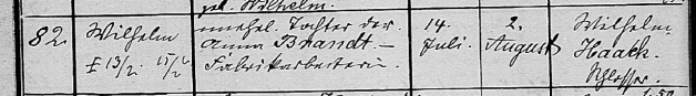 Wilhelm Brand Baptism, Born 14 July 1885, baptized 2 August 1885. Illegitimate child of Anna Brand. Hessen, Landeskirchliches Archiv der Evangelischen Kirche von Kurhessen Waldeck, KasselStadt, Wehlheiden, Kirchenbuch 1973-1894, Bild 468, Wilhelm Brand, 1886, database online, Archion (www.archion.de, accessed 2 February 2023)