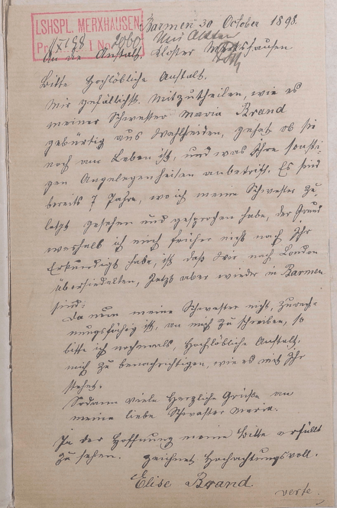 In a letter dated 30 October 1898, Eliza inquiries about her sister Maria, who was born in Wehlheiden. It has been seven years since Eliza last heard from or spoke to her sister, and she asks whether Maria is still alive. She explains that she had not sought news of Maria she lived in London, but now that she has returned to Barmen, she is eager for an update. Eliza concludes the letter by sending her best wishes to her sister.