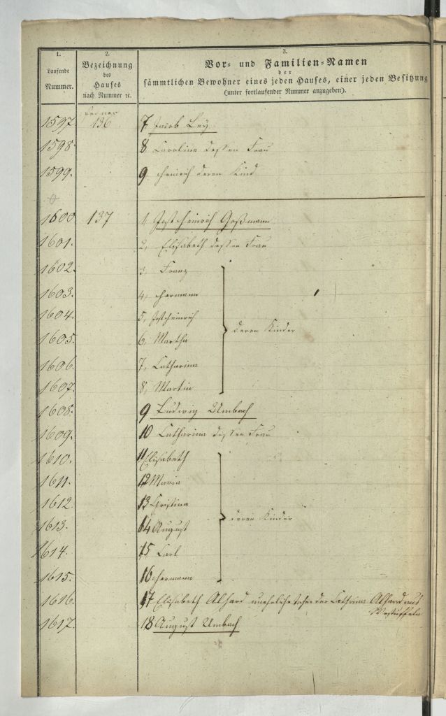 In 1846, Jost Heinrich Gossmann lived with his wife Elisabeth and six children: Franz, Hermann, Jost Heinrich, Martha, Catherina, and Martin. One daughter, who served as a maid out of town, was not listed by name with the household but in a note on the second page. By 1846, Jost Heinrich had seven children still living: Franz from his first marriage, Maria from his second marriage, and five living children from his third wife, Gertrud Elisabeth. Six of his children are listed by name under Jost Heinrich and his wife, with a note on the second page mentioning a daughter who served out of town as a maid. You can see that note on the second page on line 137 next to age 46. That daughter was Maria Gossmann.