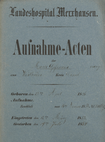 In a police directive dated 8 September 1857 it says that the circumstances of the father, Jost Heinrich Gossmann, does not allow him to care for his mental ill daughter during the day as he has business to attend to. He also says that his wife, stepmother to Maria, is hated by his daughter and he fears they are both in mortal danger. This is the reason Jost Heinrich Gossmann was requesting for his daughter Maria to be placed in the Merxhausen State Hosptial. It is also noted that he or other relatives are unable to pay for her time there.